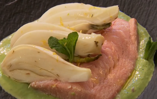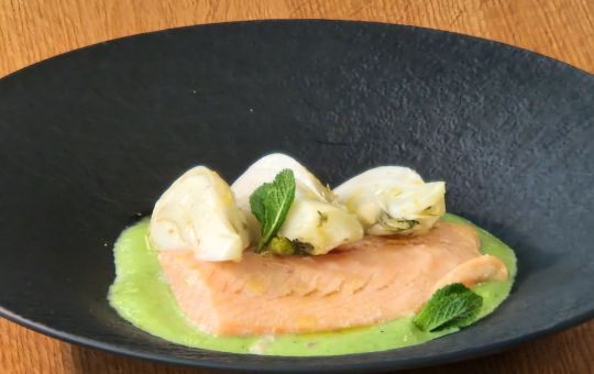 Saumon poché, coulis de petits pois et fenouil confit au citron