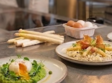 Oeuf parfait sur son crémeux de petit pois, Risotto aux asperges blanches et chips de parme. -