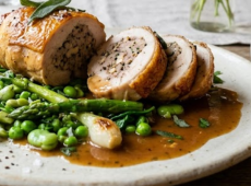 Ballotine de volaille, beurre à la sauge, légumes verts de saison + Dessert du chef offert. -