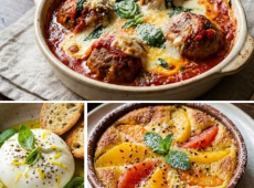 Boulette de veau cuite dans la sauce tomate et gratiné, Burrata au citron. Gratin d'agrumes au piment d'Espelette. -