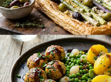 Tarte fine aux asperges de couleur et aux olives, Boulette de volaille et petits pois, Jus corsé au miel et pinot noir, pomme de terre au safran. -