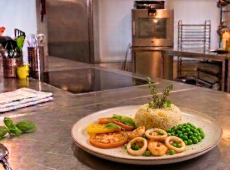 Viva Espana ! Encornets à la catalane, Brochette de pluma et chorizo ibérique, riz façon paëlla, Crème catalane aux segments de pamplemousse. -