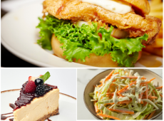 Burger de cabillaud façon Fish and chips, Mayonnaise au curry et frites maison, Salade coleslaw, Cheese-cake aux spéculos et aux fruits rouges. -
