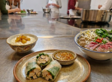 Rouleau de printemps à la volaille, vinaigrette aux cacahuètes grillées. Phô Vietnamien de boeuf Riz au lait de coco et ananas -