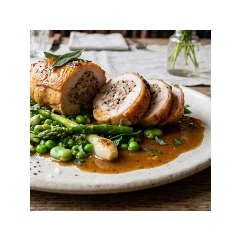 Ballotine de volaille, beurre à la sauge, légumes verts de saison